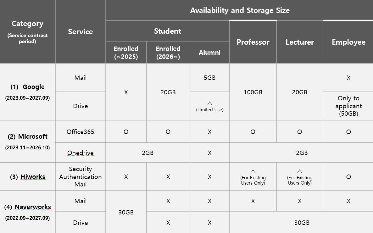 - Current enrolled students may continue to use the Naver Works mail system until August 2027, with a planned transition to Google Mail beginning in the second half of 2026.